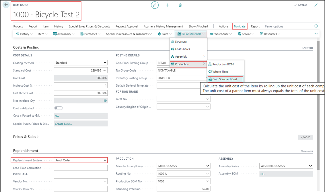 The Item is produced and consists of a BOM and a Routing. Item -> Costing Method is Standard.