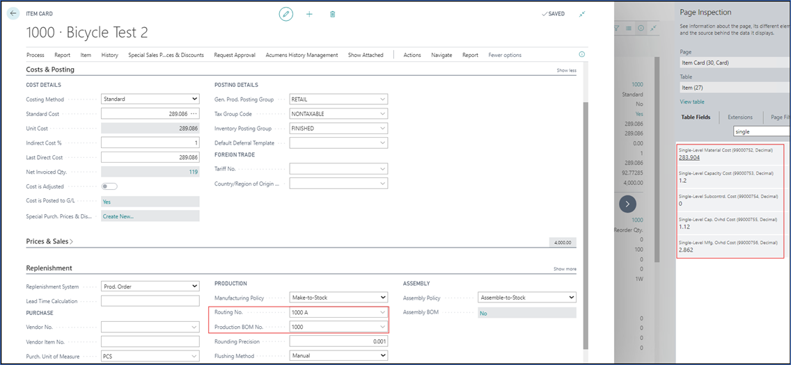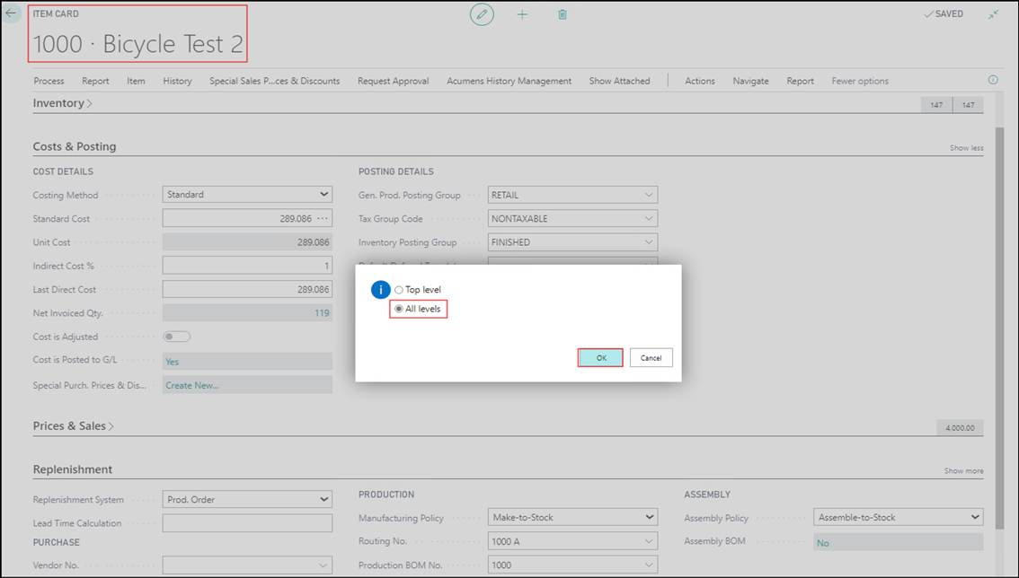 | Single level | Produced item is equal to the total cost of all purchased or subassembly items on that item's production BOM. |