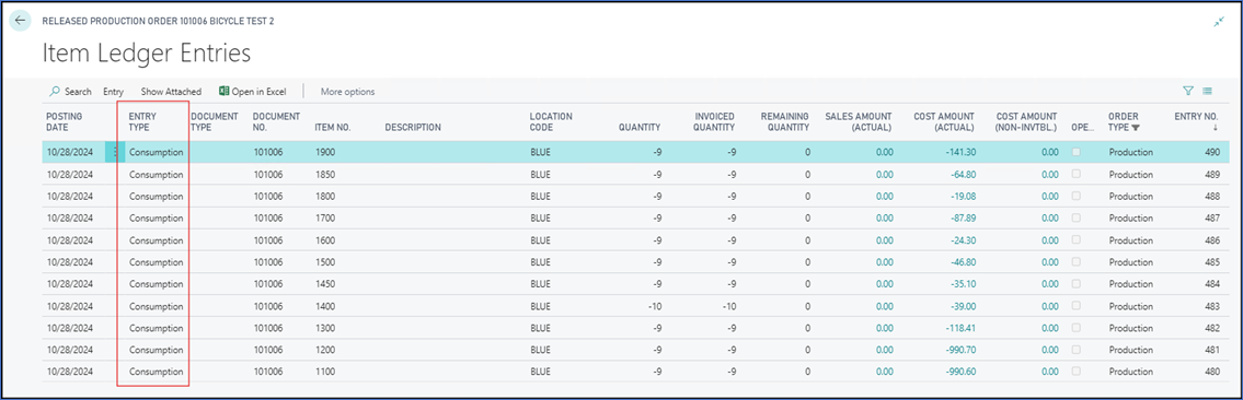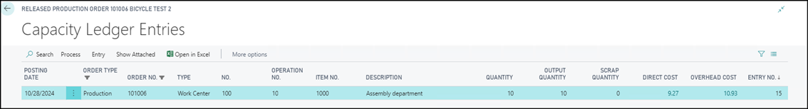 Item Ledger Entry:An output item ledger entry is posted to add the finished goods item to inventory.