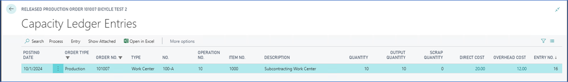 Capacity Ledger Entry:A capacity ledger entry is posted for the total subcontracting cost.
